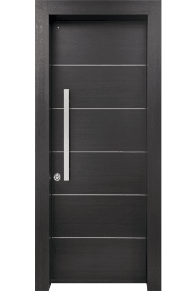 עיצוב הדלת: דגם אמיליה מחופה עץ אגוז אפריקאי בשילוב פסי אלומיניום (מומלץ כאשר ניתן להגן על הדלת מפגיעה ישירה של שמש ומגע עם מים).