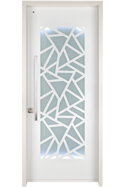 עיצוב הדלת: דלת עם שילובי זכוכית הכלואה בין חיתוכי פלדה בקווים גיאומטריים. ניתן לשלב זכוכית חלבית או פלדה צבועה בגב הסורג ואורות לדים בגוף הדלת, בחלקה העליון והתחתון